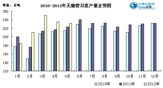 5月份國內生產無縫管232萬噸,同比增長9.3%。環比4月份減產3.5萬噸,環比降低1.49%。1-5月份累計生產無縫管1095.3萬噸,同比增長10.4%。