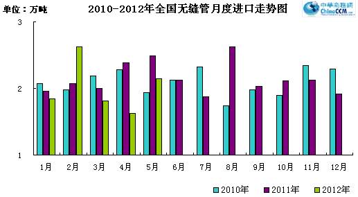 20125月份進口無縫管2.15萬噸,比去年同期少進口0.34萬噸,同比下降13.65%5月份進口環比上月增加0.53萬噸,環比增長32.7%。20121-5月份累計進口無縫管10.05萬噸,同比降低7.93%。