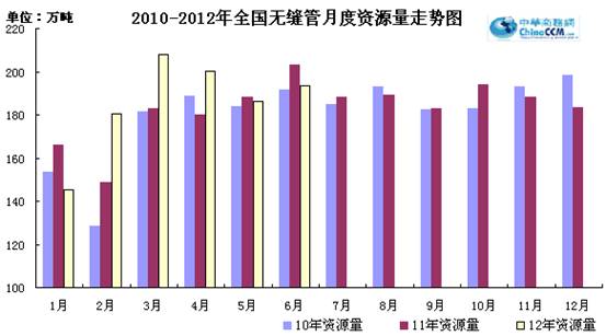 從供需情況來看,六月份新增資源量環比小福增長,同比小福下降,但市場需求的低迷狀況并未因新增資源同比下降而又些許改善,供應過剩依然是目前市場價格一蹶不振的主因。從這個因素來看,八月份國內無縫管市場企穩壓力依然較大。