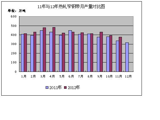 2012年1-11月份國內熱軋窄帶鋼產量累計4703萬噸,環比11年1-11月份累計總產量4439.8萬噸增產263.2萬噸,環比增長5.93%。我們預計十二月份國內熱軋窄鋼帶產量將不會低于300萬噸,也就是12年全年熱軋窄鋼帶產量將不會低于5000萬噸。而11年度國內熱軋窄鋼帶總產量4754萬噸,本年度帶鋼產量較上一年度總產量明顯增加。從下圖帶鋼產量圖可以明顯看出,除了12年6月份帶鋼產量低于上一年度,其余月份均高于上一年度。