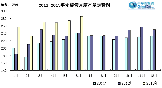 中商網(wǎng)訊:2013年6月份無縫管產(chǎn)量285.3萬噸,同比增產(chǎn)45.4萬噸,同比增長18.9%;環(huán)比增產(chǎn)11.1萬噸,環(huán)比增長4.05%。
