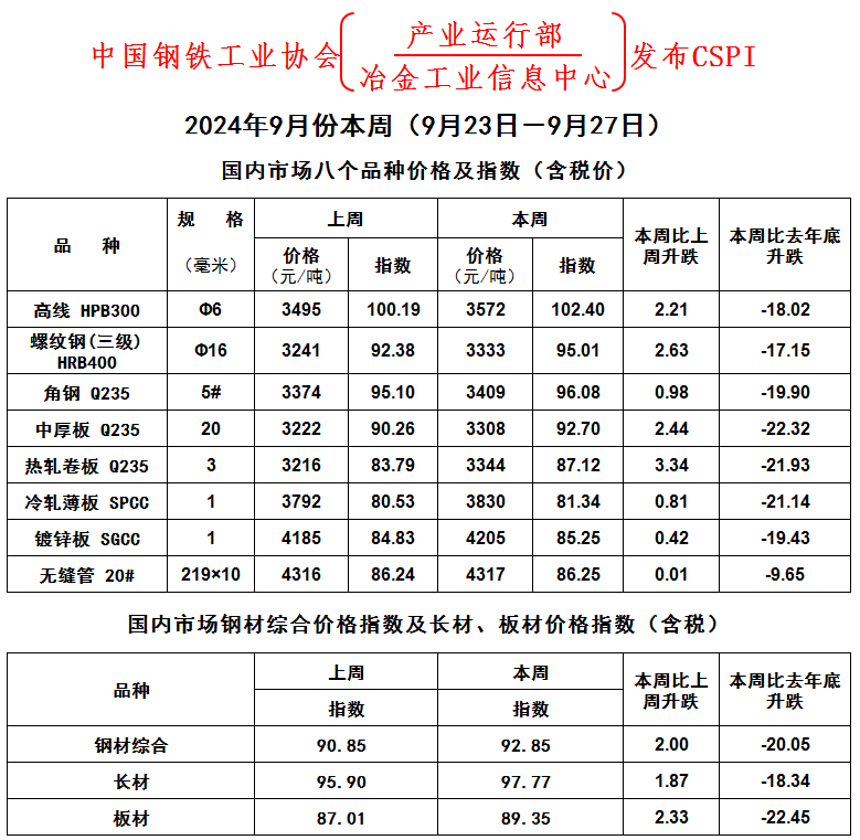 2024年9月份本周(9月23日-9月27日)國(guó)內(nèi)市場(chǎng)八個(gè)品種價(jià)格及指數(shù)