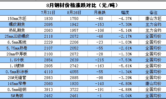 8月鋼材各品種價格進入快速下跌通道。從全國均價來看,螺紋鋼期貨、冷板、窄帶鋼價格較上月下跌較快,跌幅超過5%;而熱軋現貨雖然在月底主導市場跌到1900元/噸,但全國均價仍維持在2052元/噸左右。備受關注的唐山方坯價格8月底較上月下跌80元/噸,跌幅為4.37%。從鋼貿商反饋情況來看,本周的銷量呈快速下降態勢。上海13家大型鋼貿公司的建筑鋼材銷售總量為12900噸,與上周五的14800噸成交量相比,下降了1900噸。當前正處于月底,資金緊缺矛盾突出,下游終端用戶入市采購的不多,除了工地施工急用,一般不采購,更不會囤貨,導致銷量萎縮。
