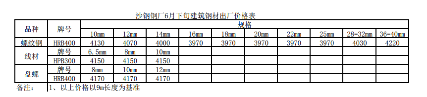 2019年沙鋼鋼廠6月下旬建筑鋼材出廠價格表執(zhí)行