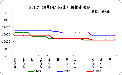 本周國內PE市場報價大穩小動,月底市場現貨資源供應缺少。周初開盤,國際原油期貨受颶風影響收盤上漲,亞洲乙烯單體因古爾邦節休市。國內石化出庫價主流趨穩,但線性期貨大幅下滑打壓市場心態,各地PE市場部分報價小跌,商家看空心態升溫,下游商家謹慎操作,對后市信心不足,多關注消息面指導,實際成交一般。周二,國際原油繼續下滑,亞洲乙烯收盤回落,PE市場心態承壓,國內石化企業出庫價穩勢主導,市場報盤多與石化出庫價持平,部分低壓價格小幅跟跌,國內線性期貨走勢震蕩,市場人士觀望情緒濃,隨行就市心態占據主導,且月底來臨,部分商家已經完成計劃量,不急于出貨,多以穩價報盤,下游需求延續平淡,場內交投僵持。隨后,由于颶風桑迪所帶來的影響,國際原油期貨價格漲跌互現,亞洲乙烯單體走勢平穩,交投延續清淡。月底,PE市場人士多關注石化動態,中石化部分大區陸續出臺11月新價格政策,主流趨穩,部分略有調整,各地PE市場氣氛一般,下游商家對后市看法偏弱,實盤交投難有改善。臨近周末,國際原油走勢分歧,國內各地PE市場高壓/線性貨源偏緊,場內持貨商家小幅調漲報價尋求成交,但低壓部分品種走勢不佳,價格小幅松動,市場報價跌漲互現,下游實際需求跟進有限,場內觀望心態明顯,成交繼續受阻。