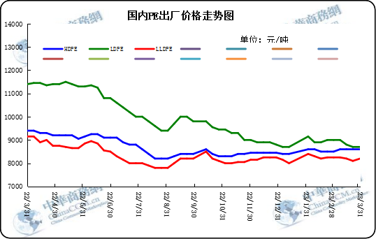 本月,國內聚乙烯價格延續弱勢,貿易商出貨情況一般,進入3月份,下游需求進入旺季,下游制品產能利用率增加明顯。但原料方面,隨著廣東石化、海南煉化前期投產的裝置生產逐步趨于穩定,以及勁海化工聚乙烯裝置的投產,市場供應量增加顯著,供需博弈加劇。低壓部分品種由于下游需求增加以及西北地區運輸問題導致部分區域部分品種供應偏緊,價格出現上漲。高壓產品由于市場供應壓力較大,供需出現一定失衡,線型品種本月價格相對堅挺,整體變化不大。
