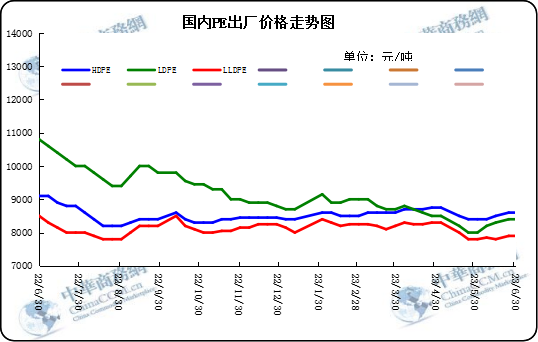 本月,國內聚乙烯價格漲跌互現,成本端利空因素主導,對市場價格支撐較乏力。本月期貨收盤受原油和市場需求影響,小幅調整為主,市場需求弱勢疊加原油震蕩下跌,市場價格緩慢恢復,當前市場走勢偏利空,下游廠家接貨情況較前期有所好轉,但囤貨量和成交量一般,月末市場價格窄幅震蕩,頹勢難改。本月華北、華東、華南、西北市場價格走勢小幅上揚,主流地區價格恢復緩慢,難以追上上月下跌幅度,生產廠家出廠價格震蕩調整為主,地區貿易商價格調整緊跟盤面,但出貨情況較差,地區流通性不高,價格上漲困難。當前正值市場淡季,市場因廠家大規模檢修,地區供應下降,市場庫存小幅波動,供需壓力仍存,廠家檢修多以短期檢修為主,部分檢修時間長達兩個月,現階段長期停車裝置減少,前期長期裝置有后續投產計劃,未來產能將進一步增加。目前下游接貨能力有限,節假前成單率有所提高,廠家補貨較及時,市場流通量增加,但節后再度下降,對市場價格的拉漲并無太大作用,市場維持弱勢震蕩。