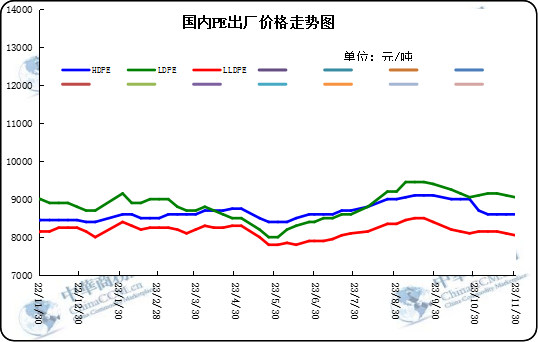 本月,國內聚乙烯市場價格寬幅震蕩,本月聚乙烯市場需求表現持續不佳,價格變動多跟隨上游原料端調整為主,期貨亦主要受原油期貨和國內需求雙重打擊下逐漸轉弱。其中本月國際原油價格震蕩下跌,成本端對國內聚乙烯的價格支撐有限。隨著傳統旺季的結束,進入需求淡季,受國內外經濟形勢的影響下,各行業終端對的需求回落速度超出預期,下游拿貨能力遠不及往年同期,需求對聚乙烯市場支撐較差。本月市場庫存仍舊處在高位的水平,廠家裝置生產轉化比亦在較高水平。隨著檢修生產線陸續恢復生產,長期檢修裝置并未增加,生產裝置檢修及轉產變動均較少,本月供應壓力較前期有所增加。月前期聚乙烯價格尚在成本引領下有高位維持的能力,然隨著月后期原油走軟,帶動聚乙烯價格加速下滑,整體來看,短期內市場在多重利空因素影響下震蕩下行。