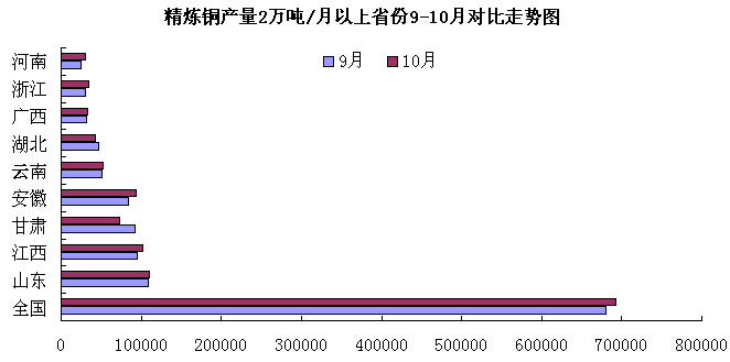 2、10月精煉銅產量較上月高出12945噸。其中,產量排名前3省排名有所調整,安徽產量同比上月高出9484噸,超過甘肅進入第三,占據當月超出總產量的大部分。