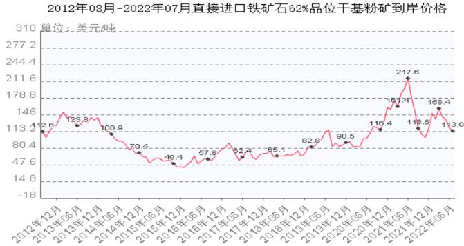 二是:2021年同期進(jìn)口鐵礦石價(jià)格曾突破200美元。受中國(guó)和國(guó)際鋼價(jià)回落影響,2022年7月進(jìn)口鐵礦石62%品位干基粉價(jià)格已經(jīng)從今年3月高峰期的158美元/噸回落到7月初的113美元。這幾天又有較大幅度回落。日照港口62%礦粉價(jià)690元/噸。但實(shí)際降價(jià)水平遠(yuǎn)低于鋼材降價(jià)幅度。仍然高于2020年以前歷史同期60-80美元的價(jià)位水平。