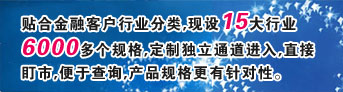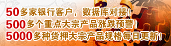 中商信息憑借龐大的產品資源優勢,從2003年開始全面介入銀行的貨押盯市業務服務,并為融資、其他結算、理財服務、貸款等相關業務提供專業的數據支持、核心產品行業研究、客戶資源共享、貸款融資推薦等服務,F已為工商、建設、農業、中國、交通五家國有銀行,平安、招商、興業、光大、華夏等十多家股份制銀行,天津、上海、吉林、廣州、青島等二十多家城市商業銀行以及一些外資銀行提供優質服務,目前可提供的數據涵蓋15個產業6000多種商品,為降低銀行的質押風險提供了強有力的支持。